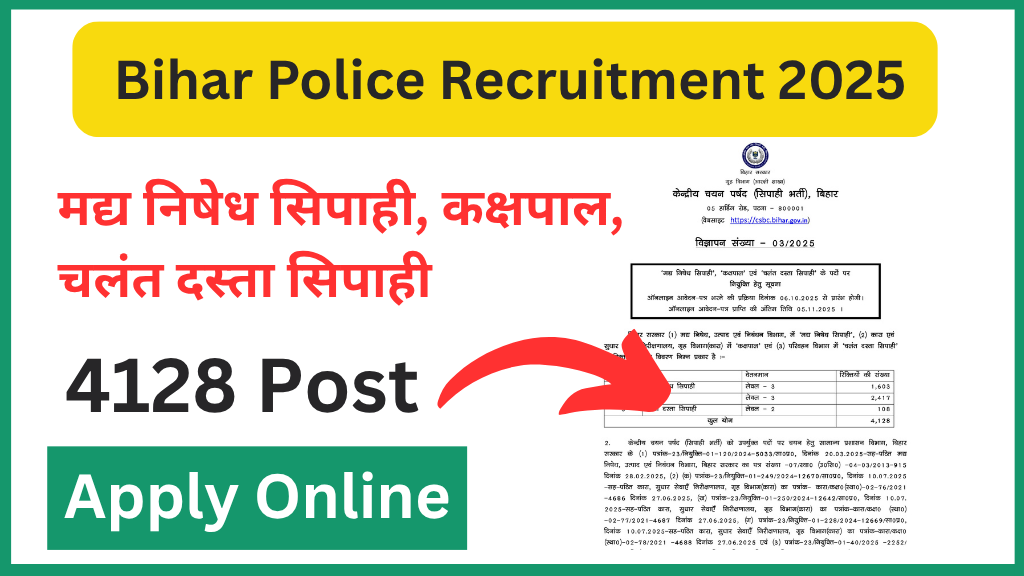 Bihar Police Recruitment 2025: बिहार में सरकारी नौकरी का सपना देखने वाले युवाओं के लिए बड़ी खुशखबरी है। केंद्रीय चयन पर्षद (सिपाही भर्ती), बिहार (CSBC) ने बिहार पुलिस भर्ती 2025 का नोटिफिकेशन जारी कर दिया है। इस भर्ती के तहत मद्य निषेध सिपाही (Prohibition Constable), कक्षपाल (Jail Warder) और चलंत दस्ता सिपाही (Mobile Squad Constable) के कुल 4128 पदों पर भर्ती होगी।