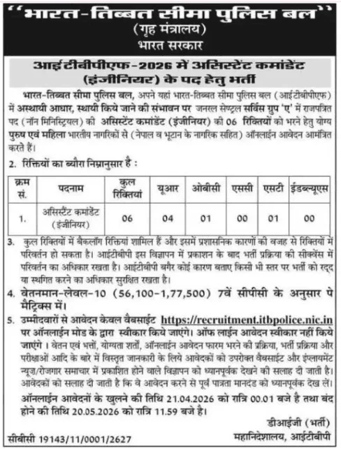 The Indo-Tibetan Border Police Force (ITBP) has officially released the recruitment notification for the post of Assistant Commandant (AC) for the year 2026. This is a prestigious opportunity for engineering graduates who want to serve the nation as Group ‘A’ Gazetted Officers in one of India’s premier Central Armed Police Forces (CAPF).