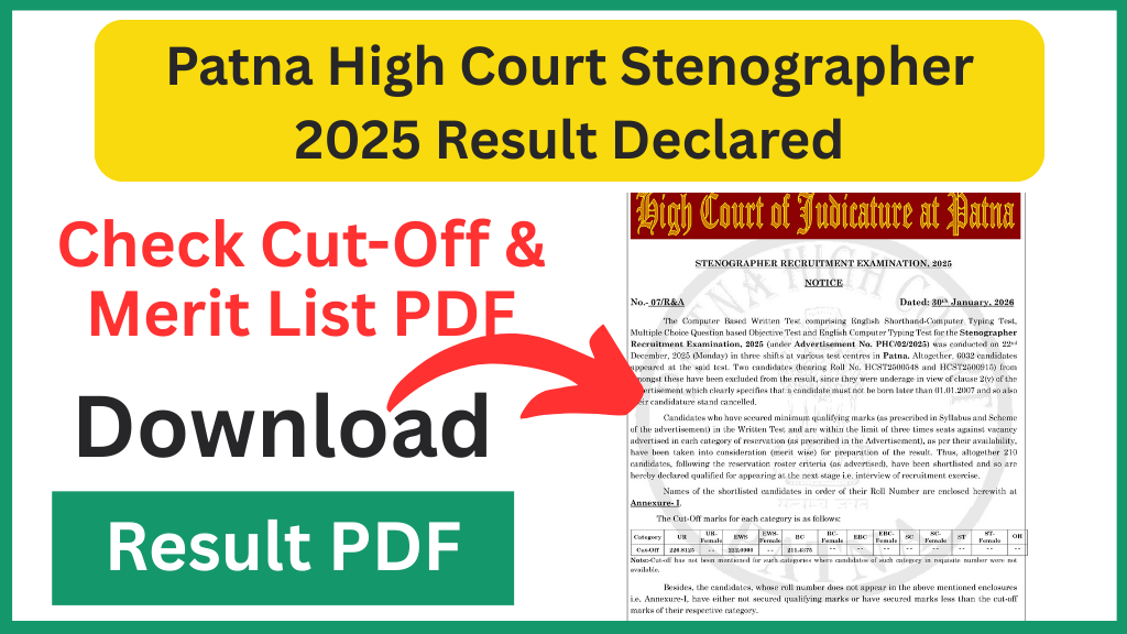Good news for candidates who appeared in the Stenographer Recruitment Examination 2025. The Patna High Court has officially declared the written test result on 30 January 2026. The Computer Based Test was conducted on 22 December 2025 in three shifts across Patna centres.