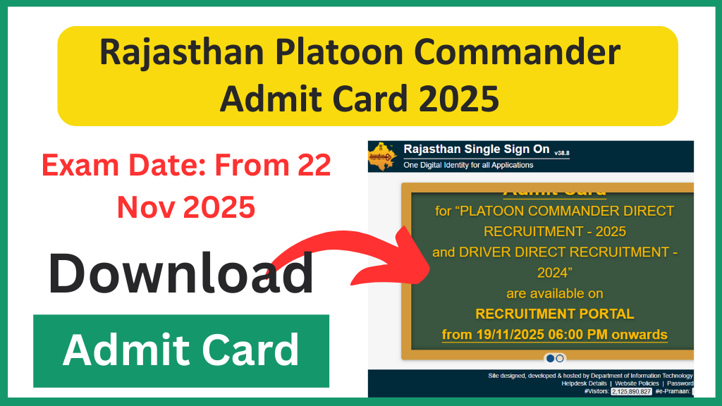 Rajasthan Platoon Commander Admit Card 2025: Rajasthan Staff Selection Board (RSSB) ने Rajasthan Platoon Commander Admit Card 2025 आधिकारिक वेबसाइट recruitment.rajasthan.gov.in पर जारी कर दिया है। जिन उम्मीदवारों ने प्लाटून कमांडर डायरेक्ट भर्ती परीक्षा 2025 के लिए आवेदन किया था, वे अब अपना एडमिट कार्ड डाउनलोड कर सकते हैं। परीक्षा का आयोजन 22 नवंबर 2025 को पूरे राजस्थान के विभिन्न केंद्रों पर किया जाएगा।