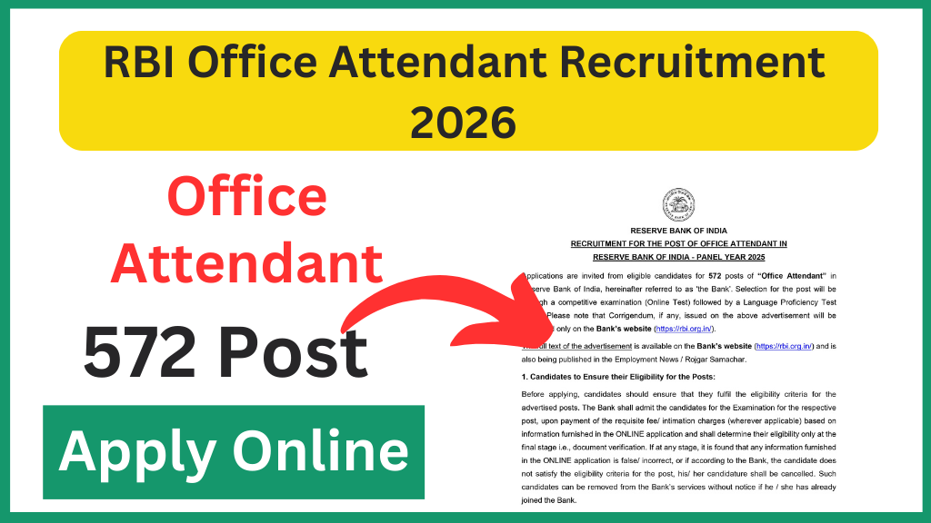 The Reserve Bank of India (RBI) has released the official notification for RBI Office Attendant Recruitment 2026 to fill 572 vacancies across various RBI offices in India. This recruitment drive is a great opportunity for 10th pass candidates who are looking for a stable central government job with attractive salary, allowances, and job security.
