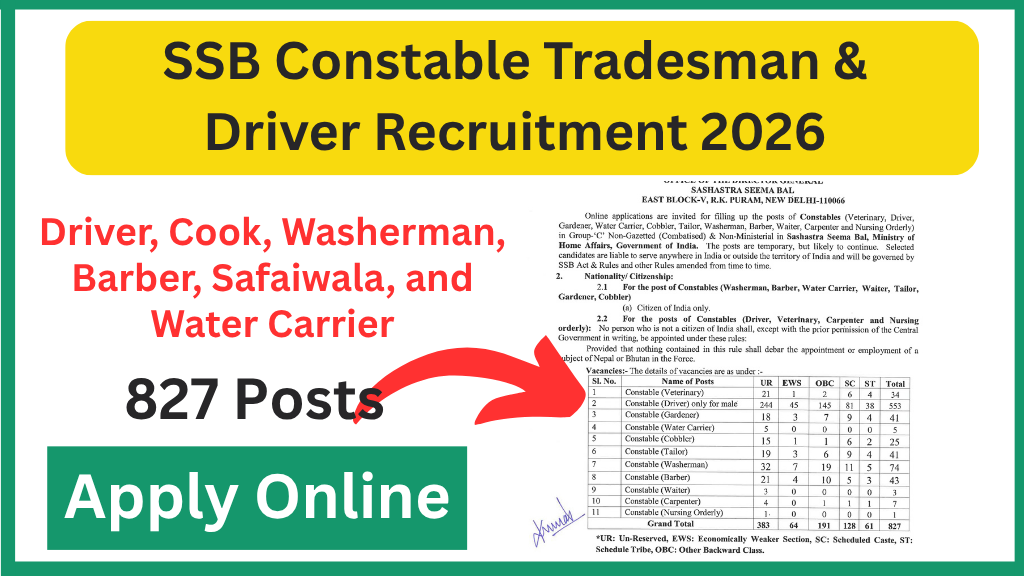 SSB Constable Tradesman Recruitment 2026: Sashastra Seema Bal (SSB) has officially announced the recruitment of 827 Constable (Tradesman) and Driver vacancies. This is a massive opportunity for 10th-pass candidates looking for a career in the defense sector. The recruitment includes various trades like Driver, Cook, Washerman, Barber, Safaiwala, and Water Carrier.